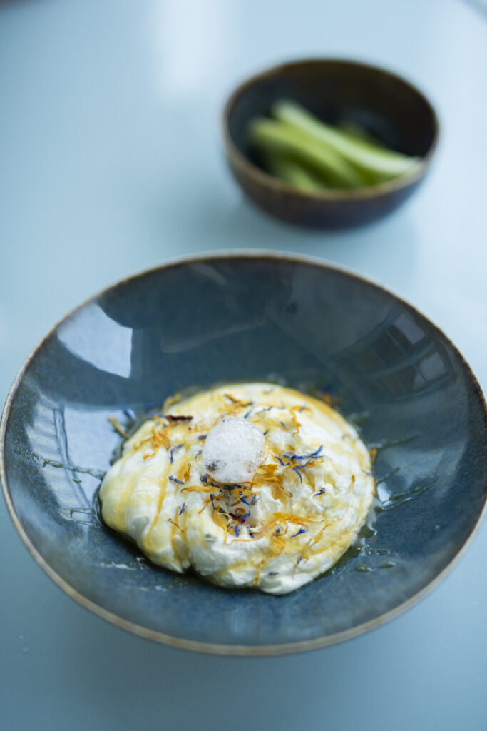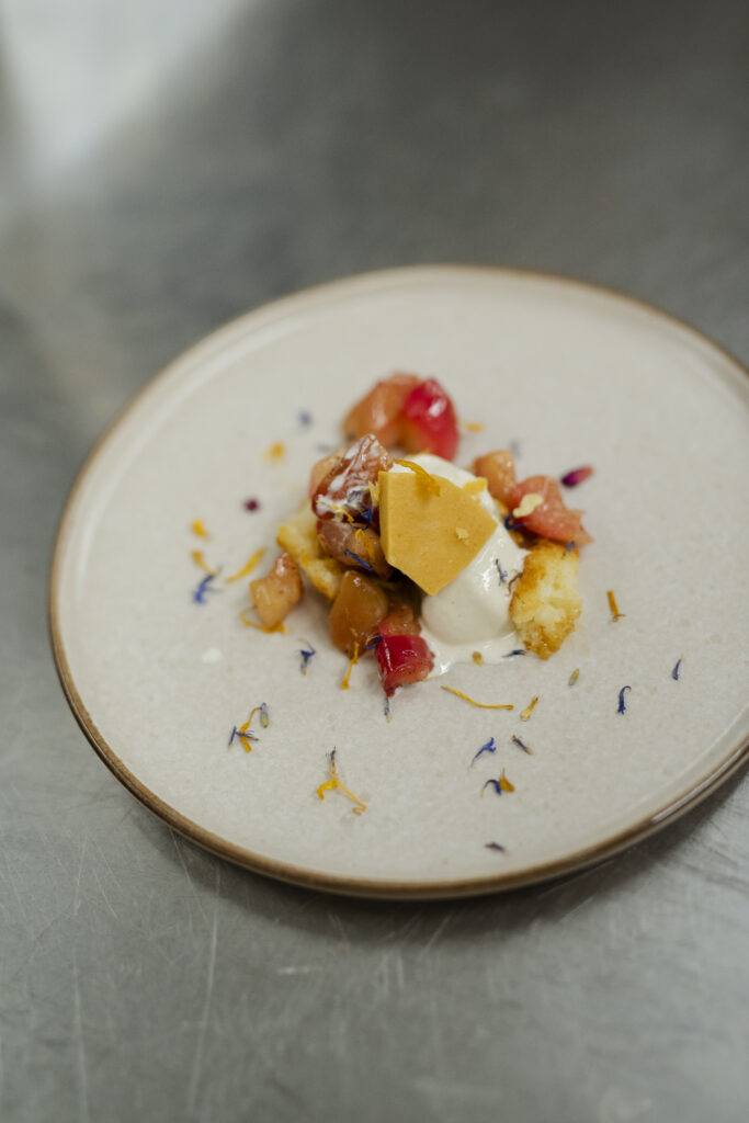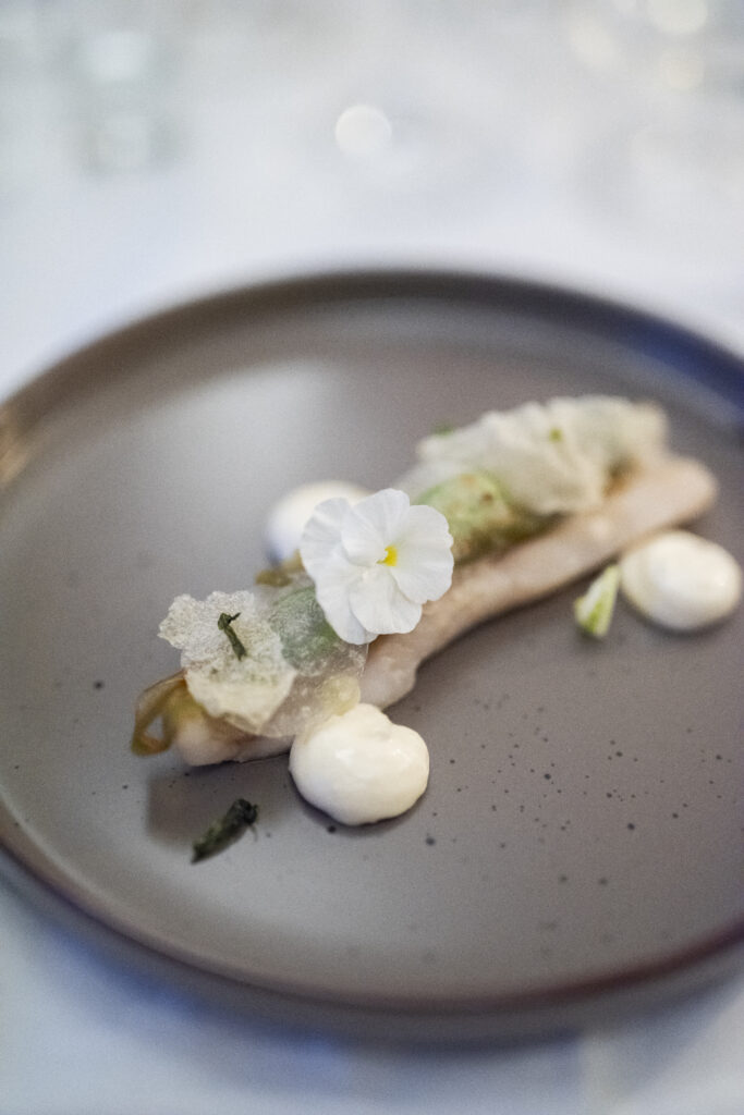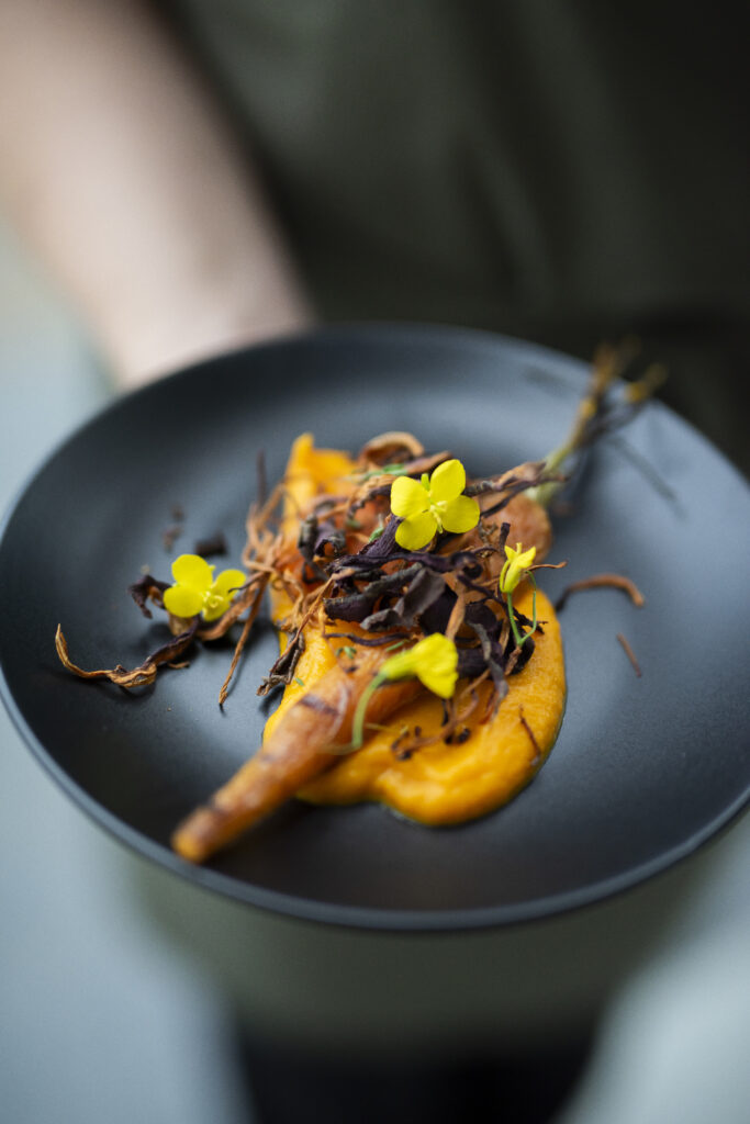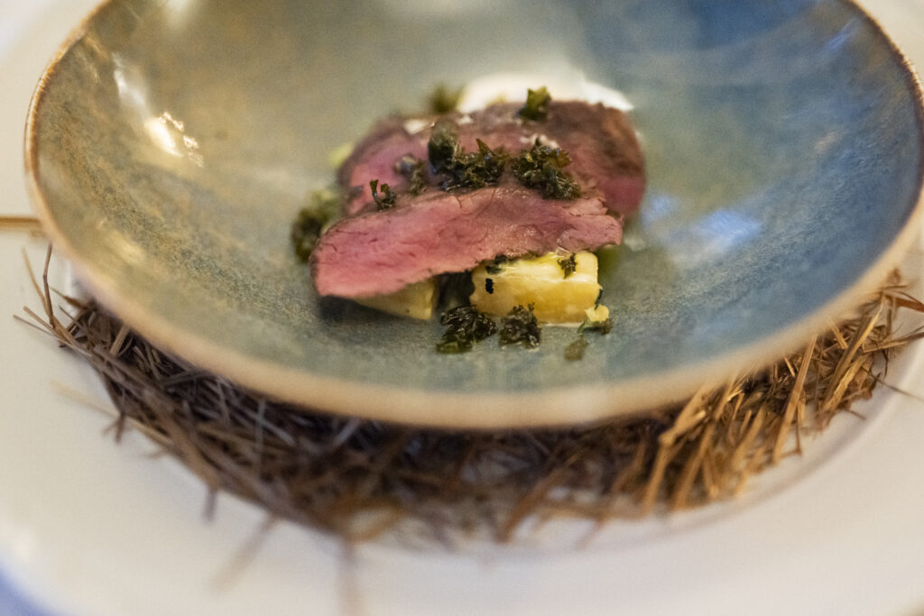 Handskuren sotad svensk ryggbiff, Eldad pärllök, Texturer på jordärtskocka, Citrontimjan, Dragonaioli