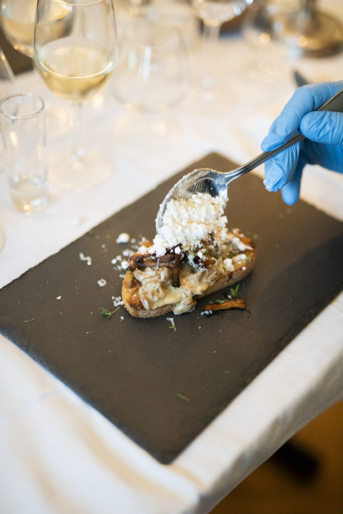 Hjortcarpaccio, Granpicklade kantareller, Libbsticka, Ruccola, Rostad råg, Lingon, Karl johan majonnäs, Västerbottenost, Solrosfrön