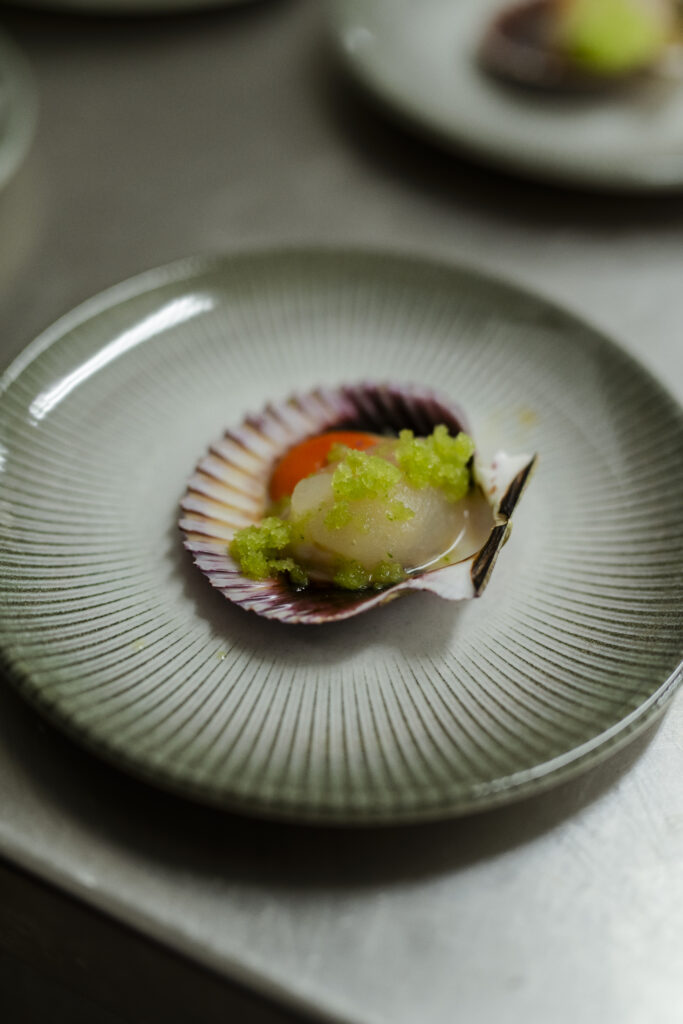 Grillad kammussla serveras i sitt eget skal med Yuzuveloute, Svart kaviar, Shisokrasse